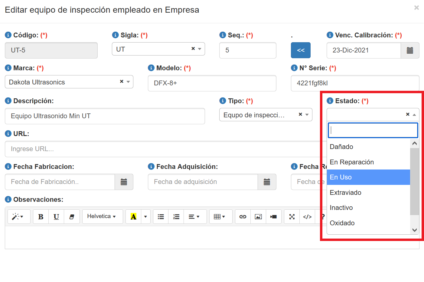 Fig 615 Extracto de pantalla, con listado de Estados de equipos en la definición de un nuevo equipo de Inspección.