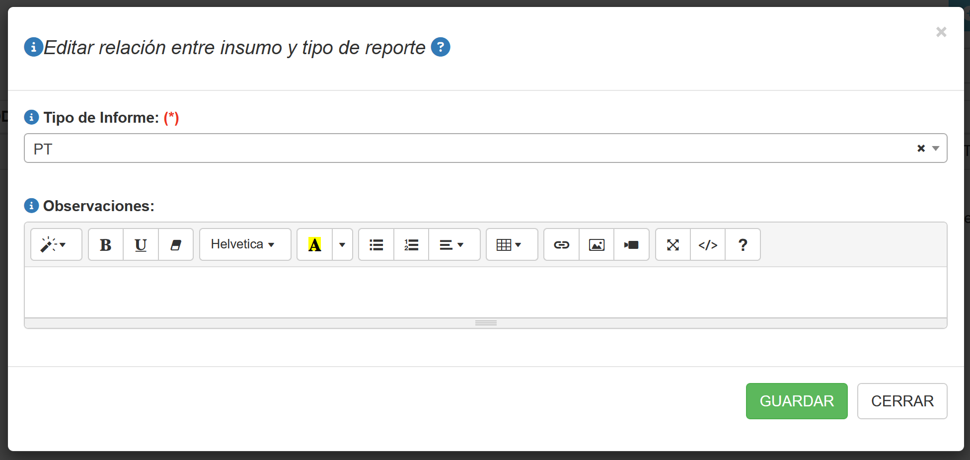 Permite agregar un nuevo Tipo de reporte relacionado con el insumo. |