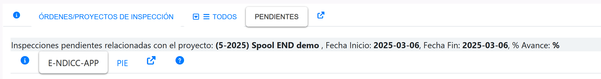 Al presionar la pestaña Pendientes de la página de Ordenes/Proyectos de inspección se muestra un segundo menú de pestañas, tal como se indica en la siguiente imagen.