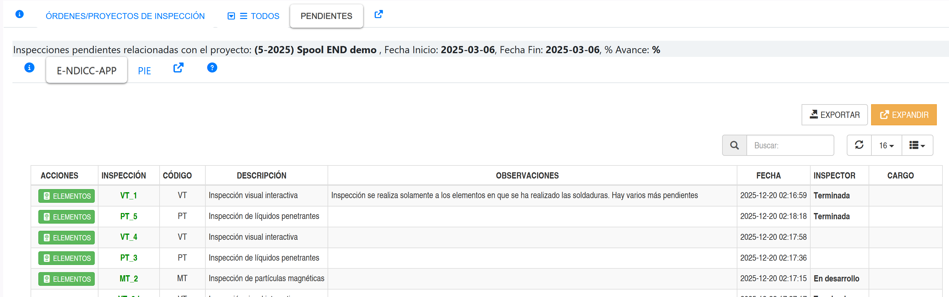 Al presionar la pestaña e-NDICC-APP de la página de Pendientes se muestra un listado de inspecciones registradas a través de la app e-NDICC-APP, tal como se muestra en la siguiente imagen.