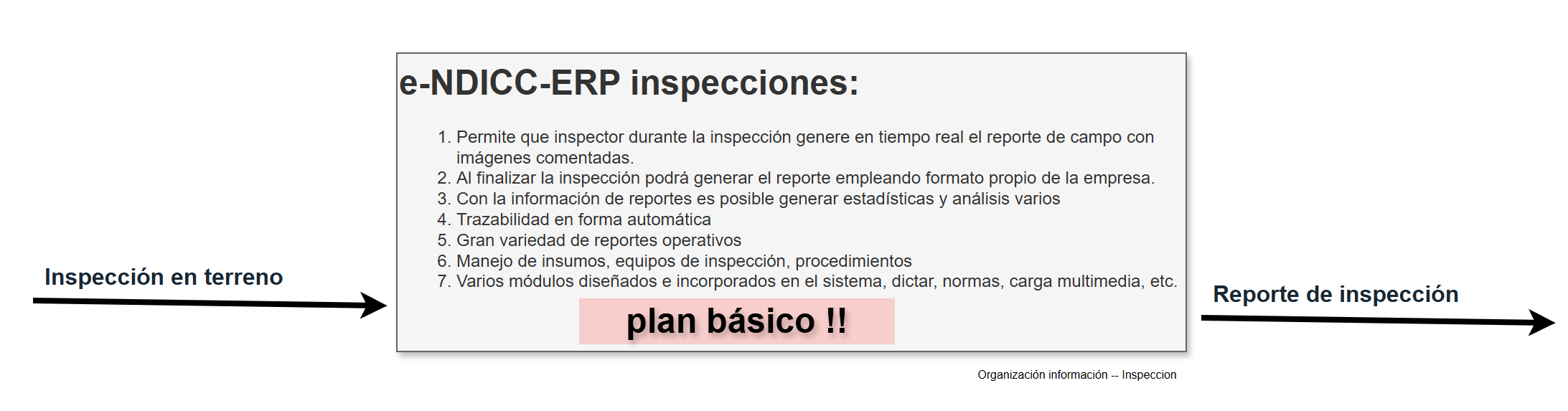 En su plan básico el sistema e-NDICC contempla todas las actividades relacionadas con la organización de la información relacionada con la inspección y la generación de varios tipos de reportes. Así, en este plan es posible en terreno montar la inspección en el sistema, dentro de la orden de inspección. Durante la inspección del objeto, ir generando el reporte de campo y una vez que se completó la inspección generar el reporte final