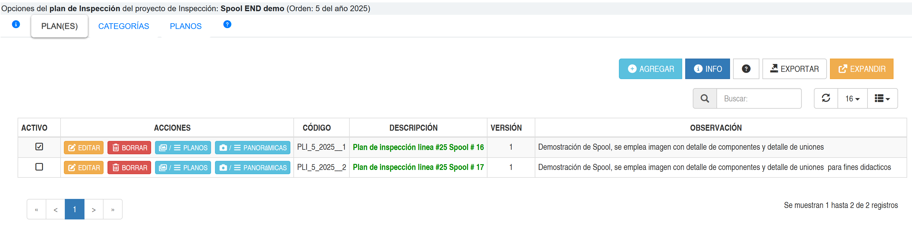 Al seleccionar la pestaña PLANES, se activará un segundo nivel de pestañas, donde se mostrará un listado de los planes de inspección que tiene esta orden, tal como se muestra en la siguiente imagen.