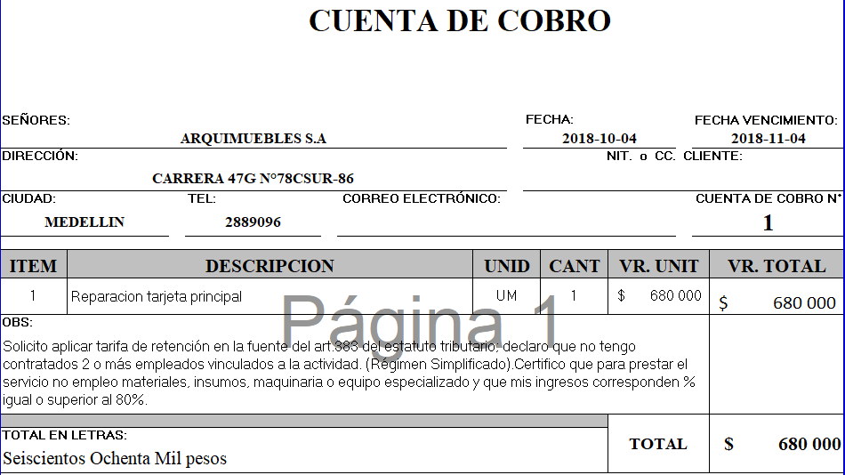 Fig 994 Ejemplo archivo de salida de Cuenta de Cobro en base a una plantilla definida anteriormente en Fig 1.