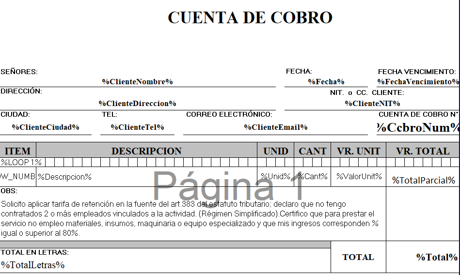El formato del documento plantilla de Cuenta de Cobro es un documento generado a su gusto que contiene una serie de variables, las cuales son reemplazadas por valores de la cuenta de cobro en Particular.
