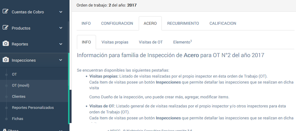 Ilustración 14 Manejo Ordenes de trabajo para dispositivos móviles. Opción familia de inspecciones acero, opción Visitas propias, opción información de inspecciones