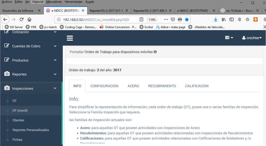 Ilustración 15 Manejo Ordenes de trabajo para dispositivos móviles. Opción familia de inspecciones acero, opción Visitas propias, opción inspecciones propias