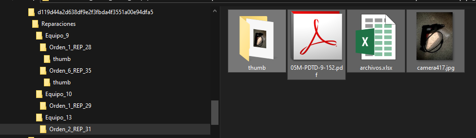 oImagen de Fotografía se guarda en capeta asociada a equipo y dentro de ella a reparación. Si hay mas de una reparación a ese equipo, todas las fotografías estarán asociadas estarán dentro de la carpeta del equipo