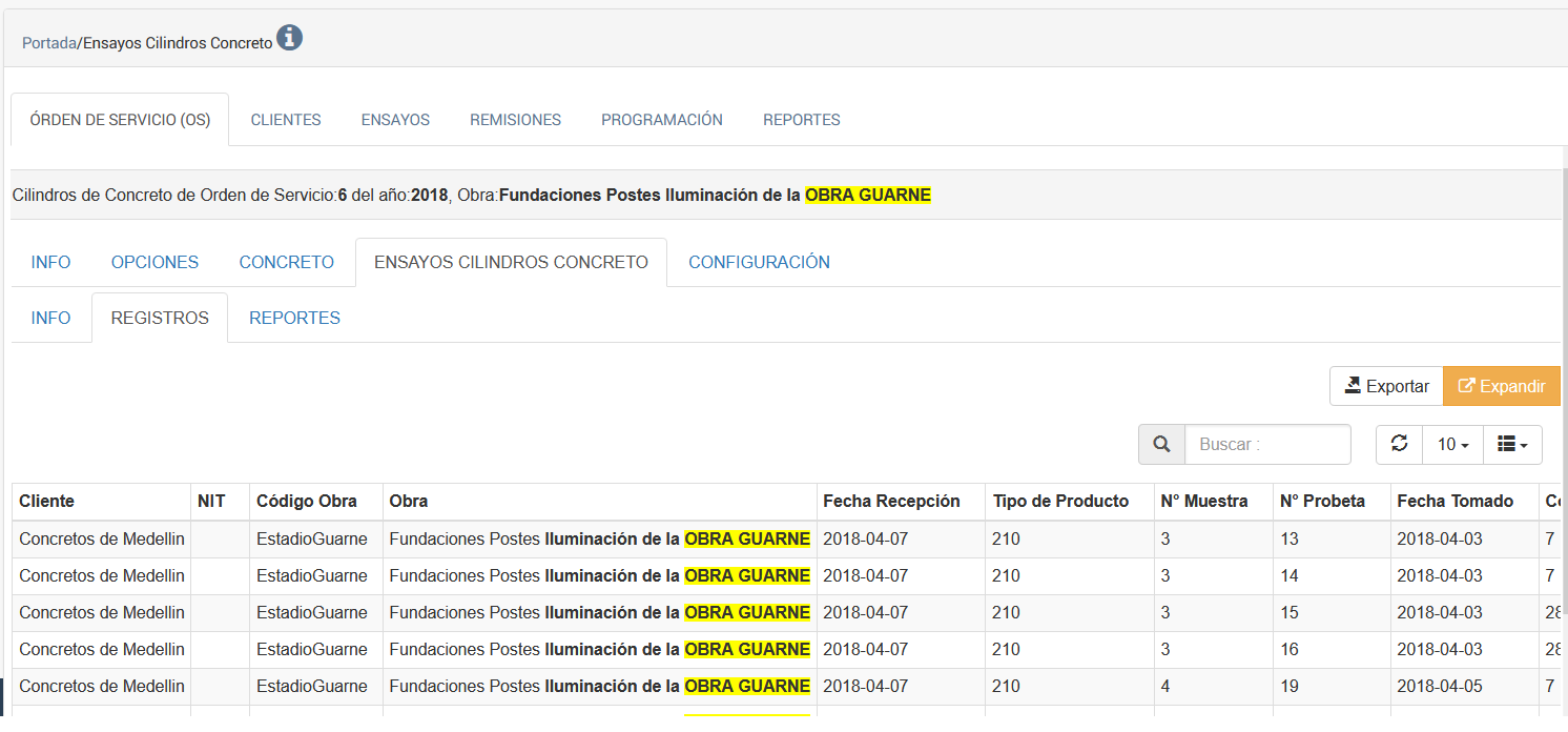 Esta opción permite desplegar un listado de los cilindros de Concreto asociados a esa orden de Servicio. Esta a su vez puede estar conformada por varias remisiones.