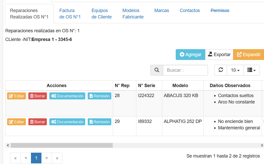 La pestaña REPARACIONES REALIZADAS contiene un listado de las reparaciones realizadas en esa Orden de Servicio.