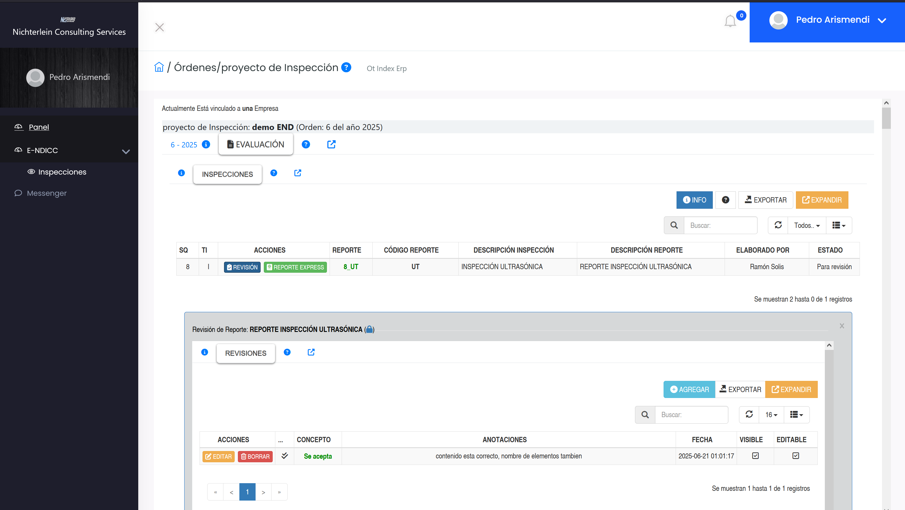 Dependiendo del proyecto de inspección pueden haber varios tipos de inspecciones en el.