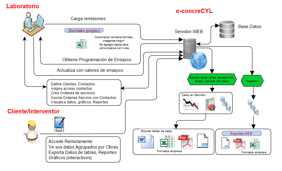 Paralelo al esquema de funcionalidad del módulo e-ConcreCYL se tiene el siguiente esquema que indica los flujos de información y que es de particular interés porque muestra los diversos participes que les puede participar en adquirir este producto.