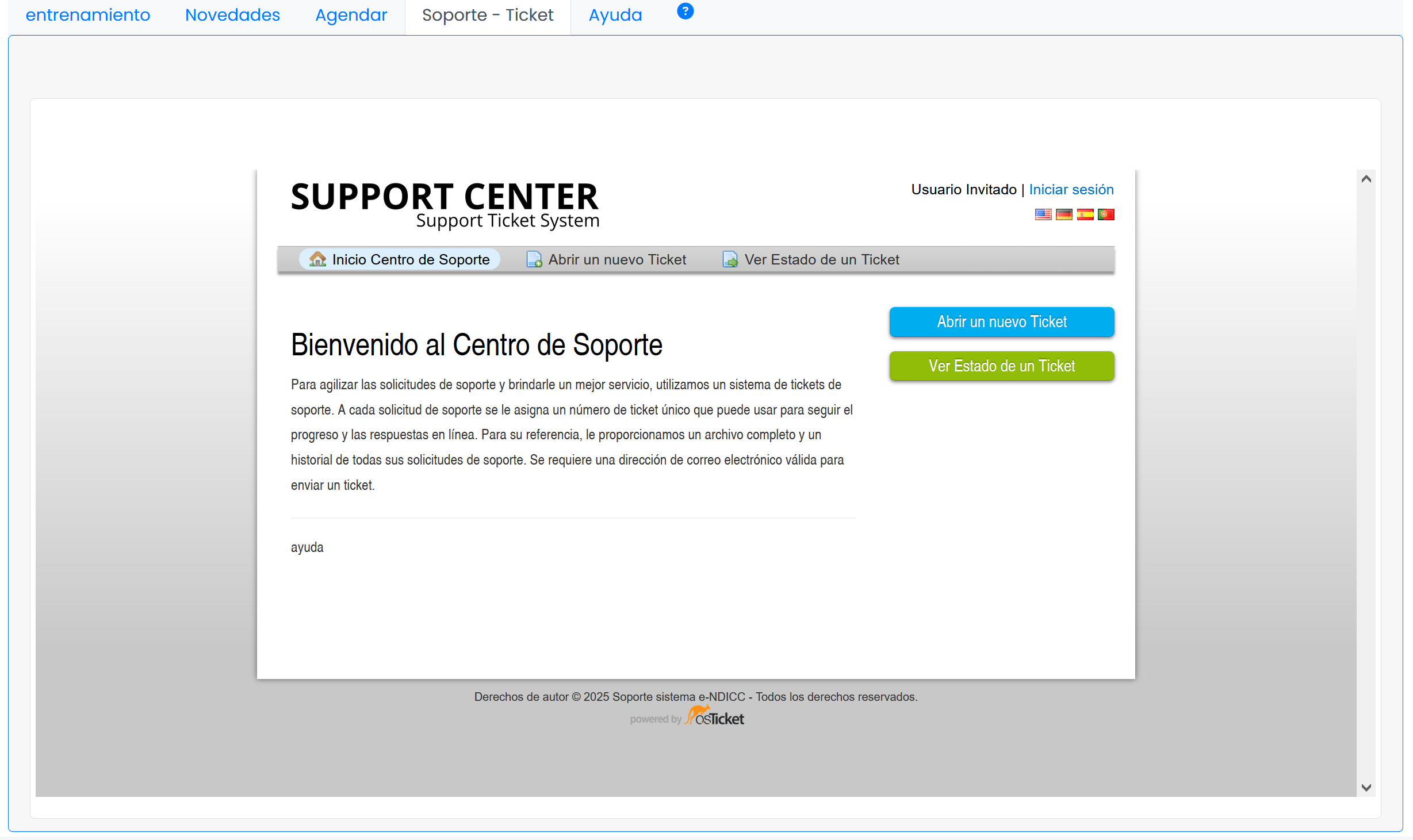 Fig 668 Extracto de pantalla de opciones "soporte-ticket", con pantalla de inicio del sistema de soporte por tickets.