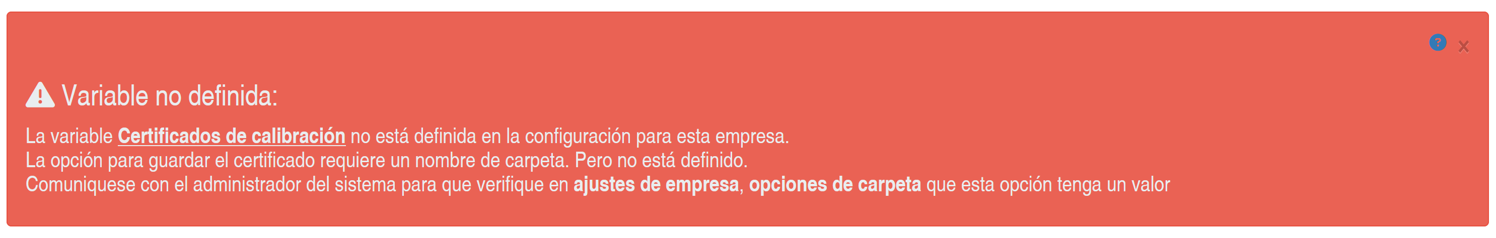 En caso de no estar definida una variable de sistema que defina nombre de carpeta, se presentará un mensaje que indica qué variable no se ha definido, tal como se muestra en la siguiente imagen.