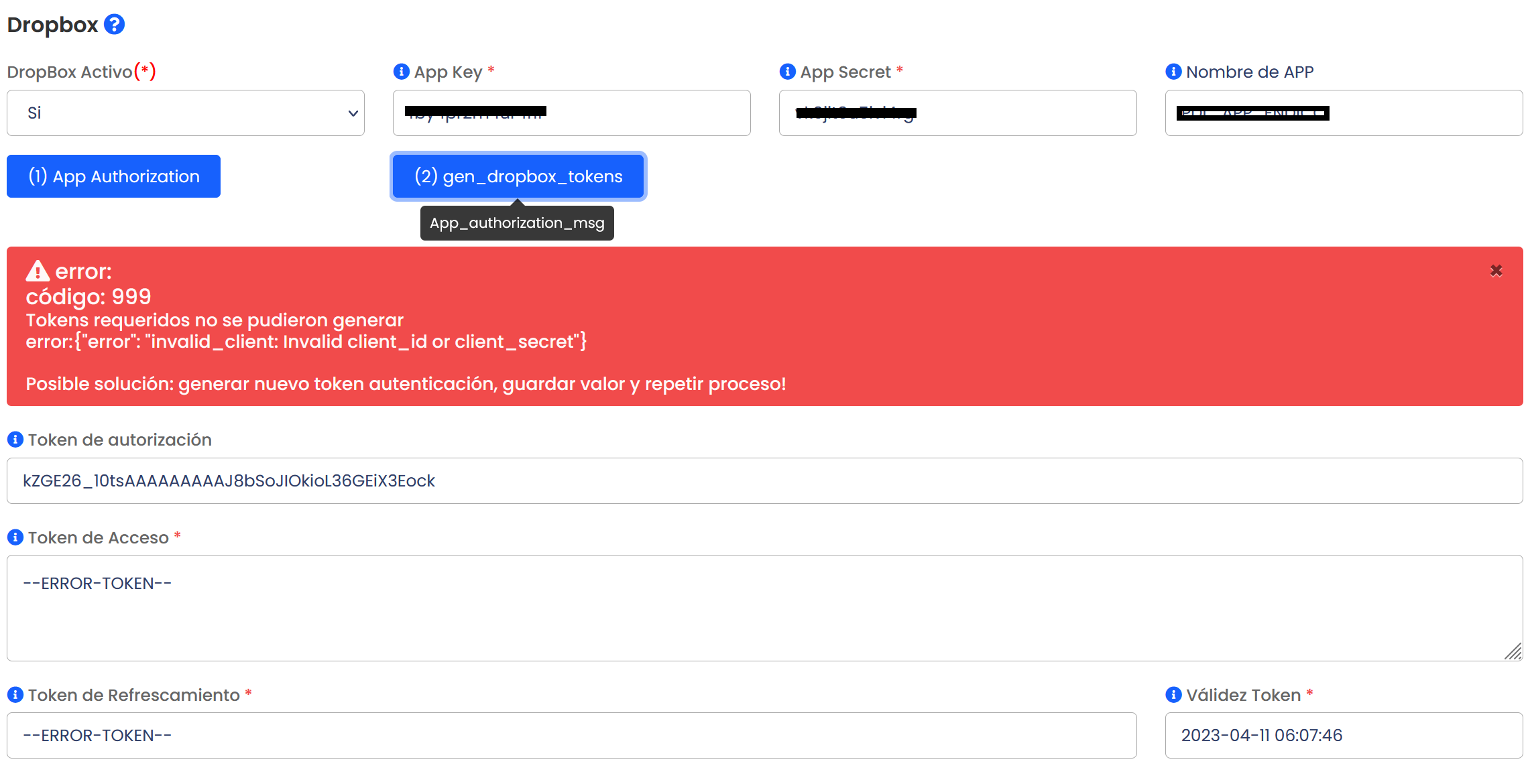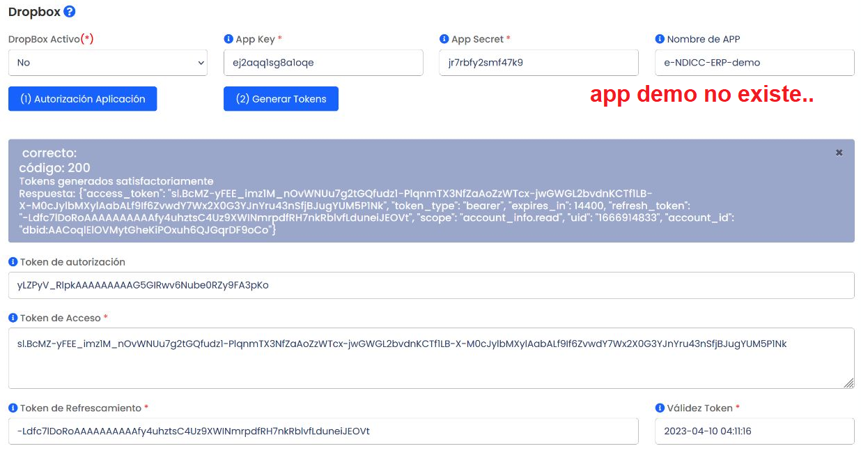 Los otros valores de tokens dependerán del tipo de cuenta de dropbox que se tenga. Más detalles, ver Creación de Tokens