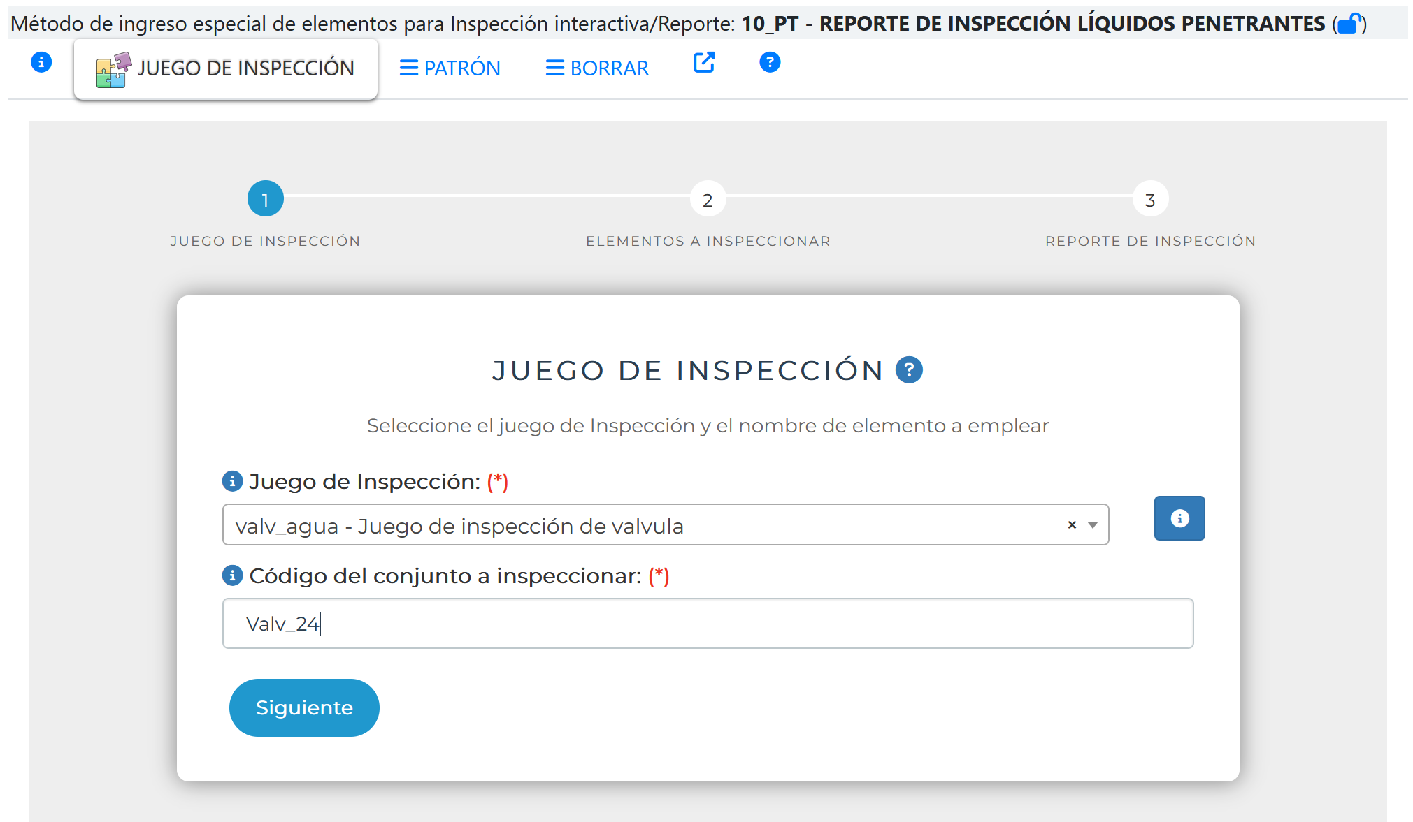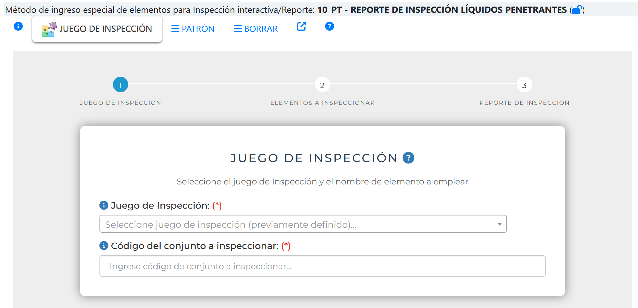 1.- Selección del Juego de Inspección y código del conjunto a inspeccionar.