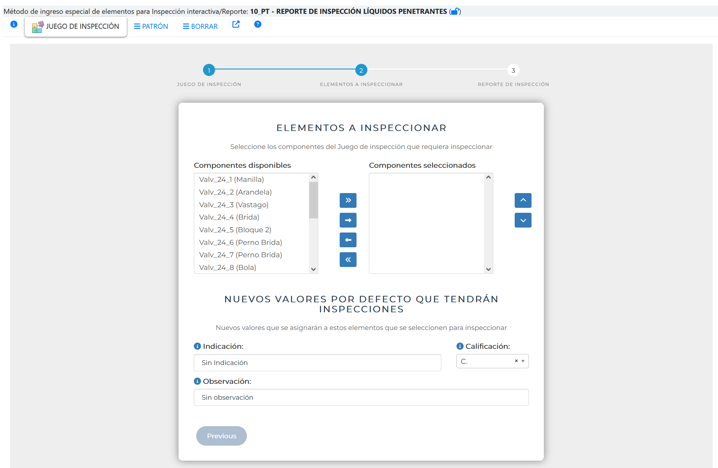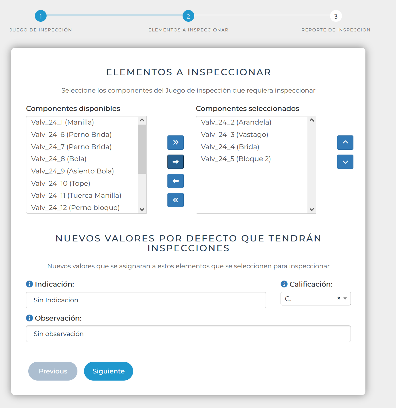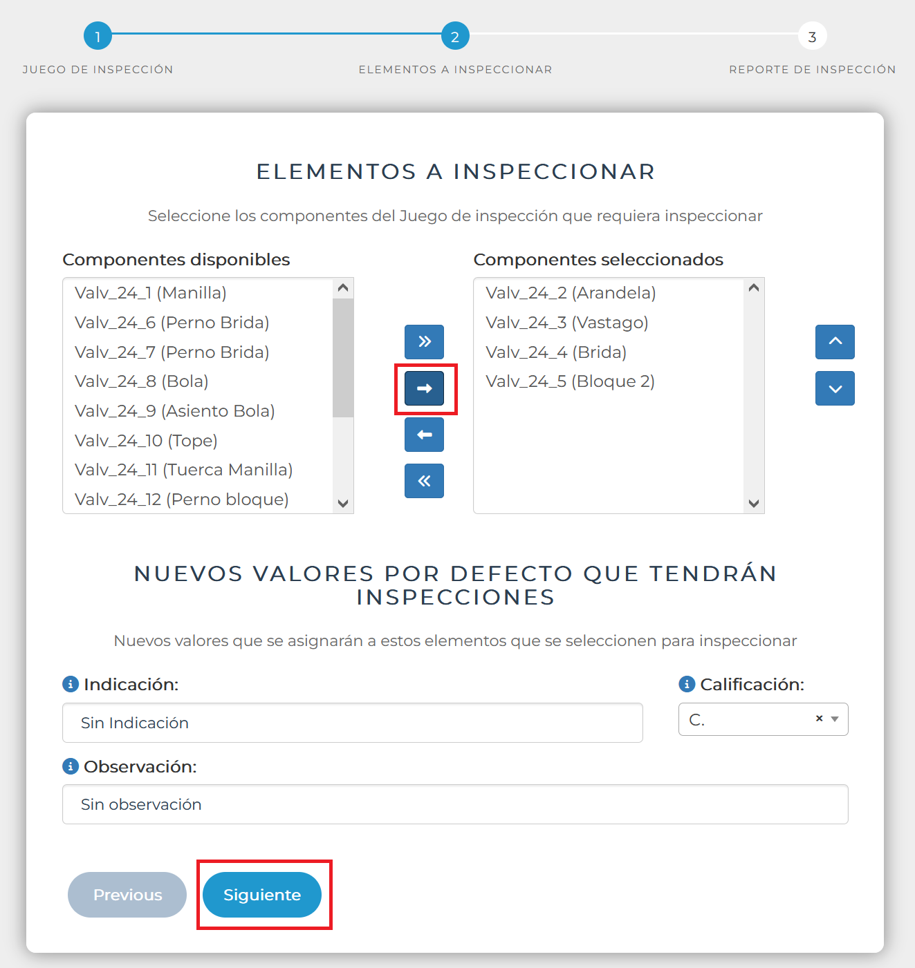 En la medida que se defina elementos en la lista de inspecciones seleccionadas, se activará el botón siguiente.
